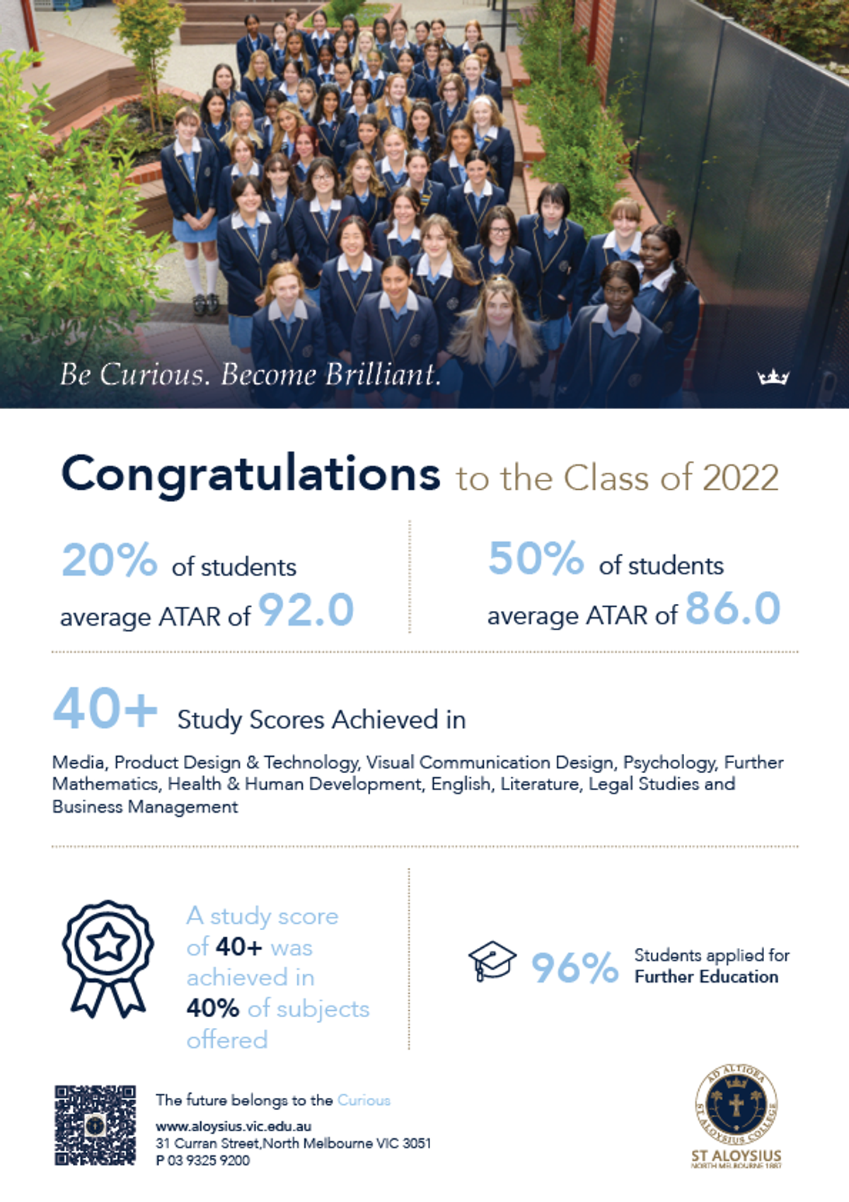 Congratulations to the Class of 2022! These results continue the very strong academic record that St Aloysius College has worked collectively to achieve over recent years.