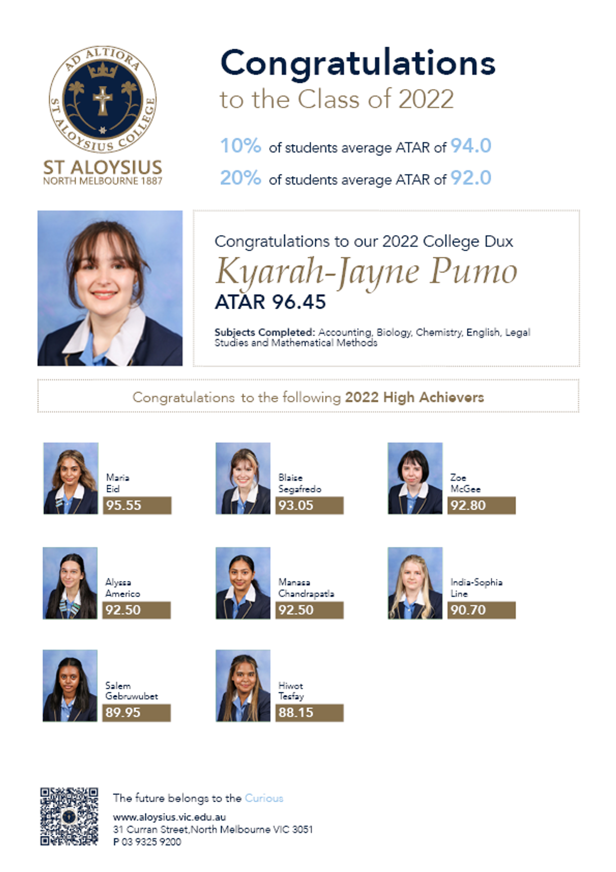 Today, we also congratulate the great personal performance of the College VCE Dux of St Aloysius College for 2022, Kyarah-Jayne Pumo with an ATAR of 96.45, Well done!