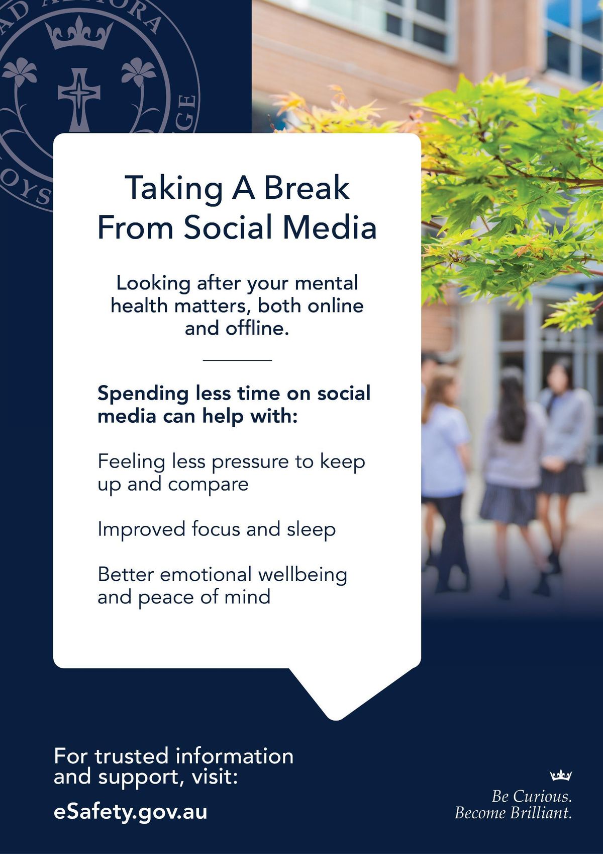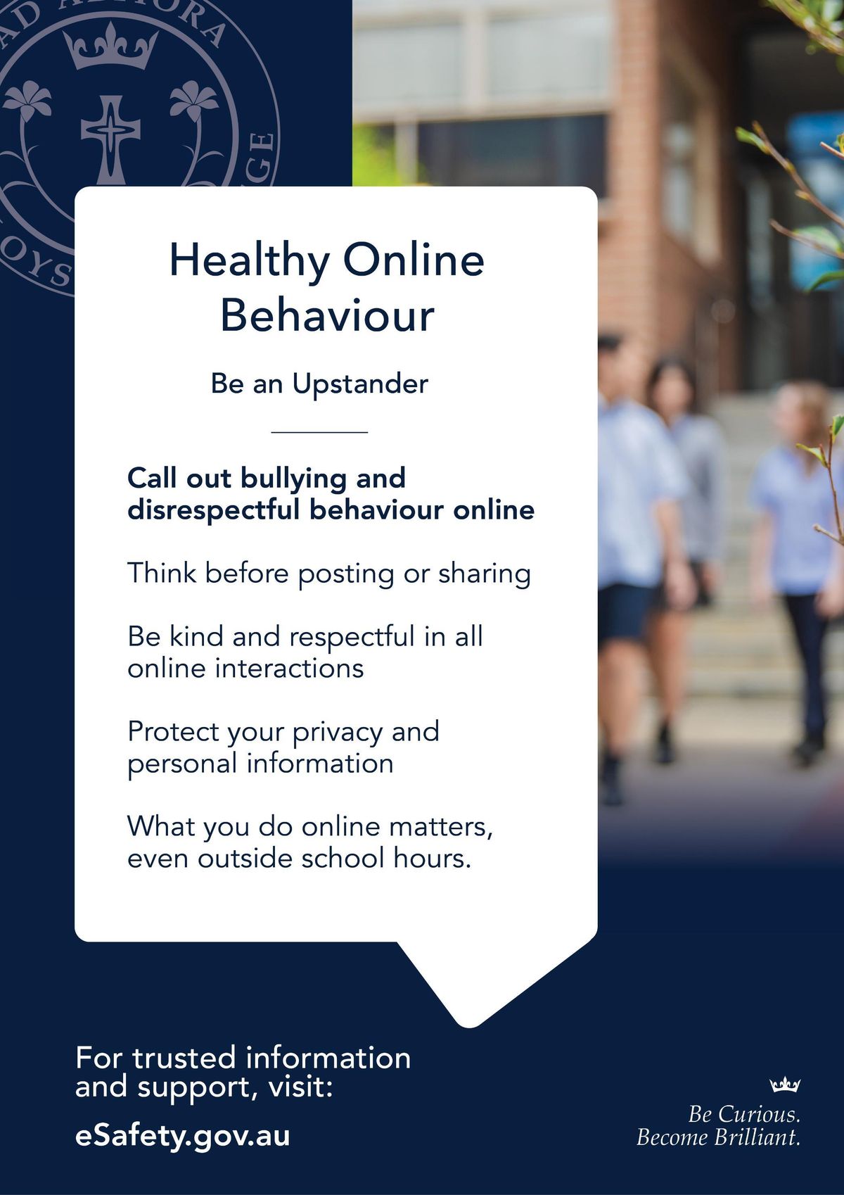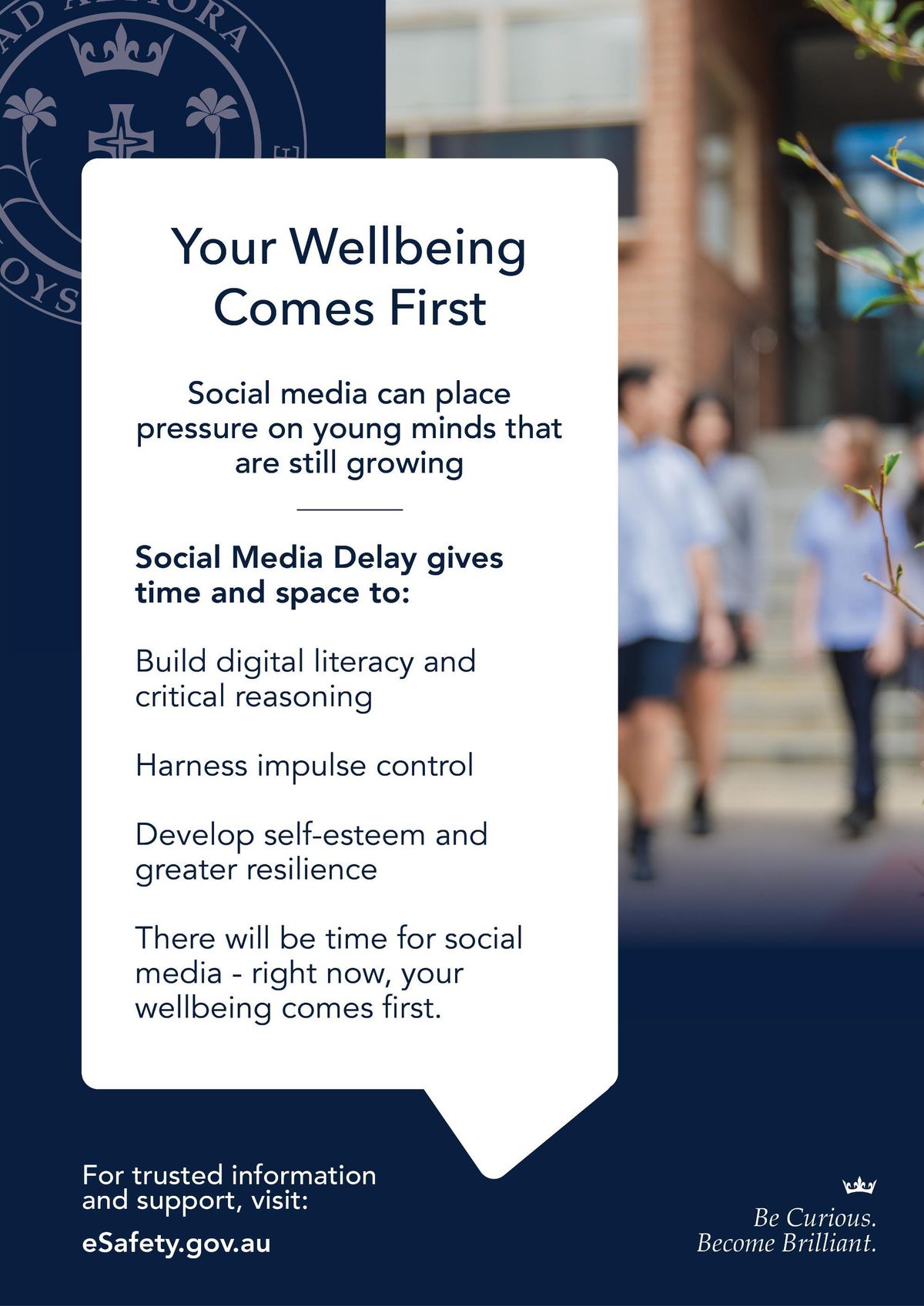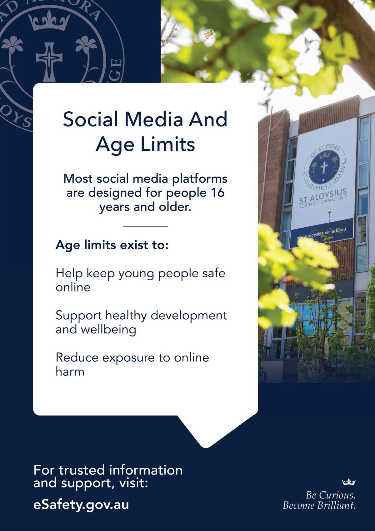 The St Aloysius College Child Safety Team consists of Deputy Principal, Assistant Principal, College Psychologist, and a representative of the Year Level Leader Team. This team is responsible for ensuring Child Safe Standards are at the forefront of decision making, programs, resources and compliance. The Social Media Delay is one legislation that helps protect our young people from online vulnerability and our parents and carers have an equally major role in its implementation.