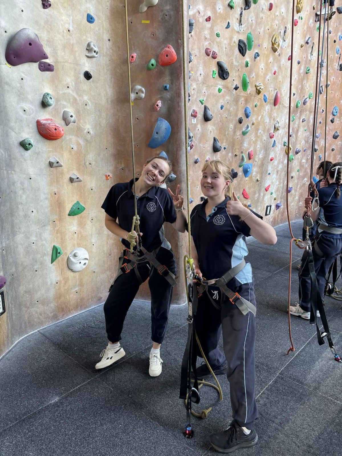 There are a number of key components for overall wellbeing gained through this experience. These include experiencing a sense of adventure through managed risk taking of scaling heights that are genuinely very high, collaboration and trust between student climber and student belayer who is responsible for taking the slack and managing their partner’s safe descent, as well as the feeling of personal achievement and competence gained by scaling to a height that reflects their individual aims and goals. The smiles and joy are evident in the photographs captured on the day below.