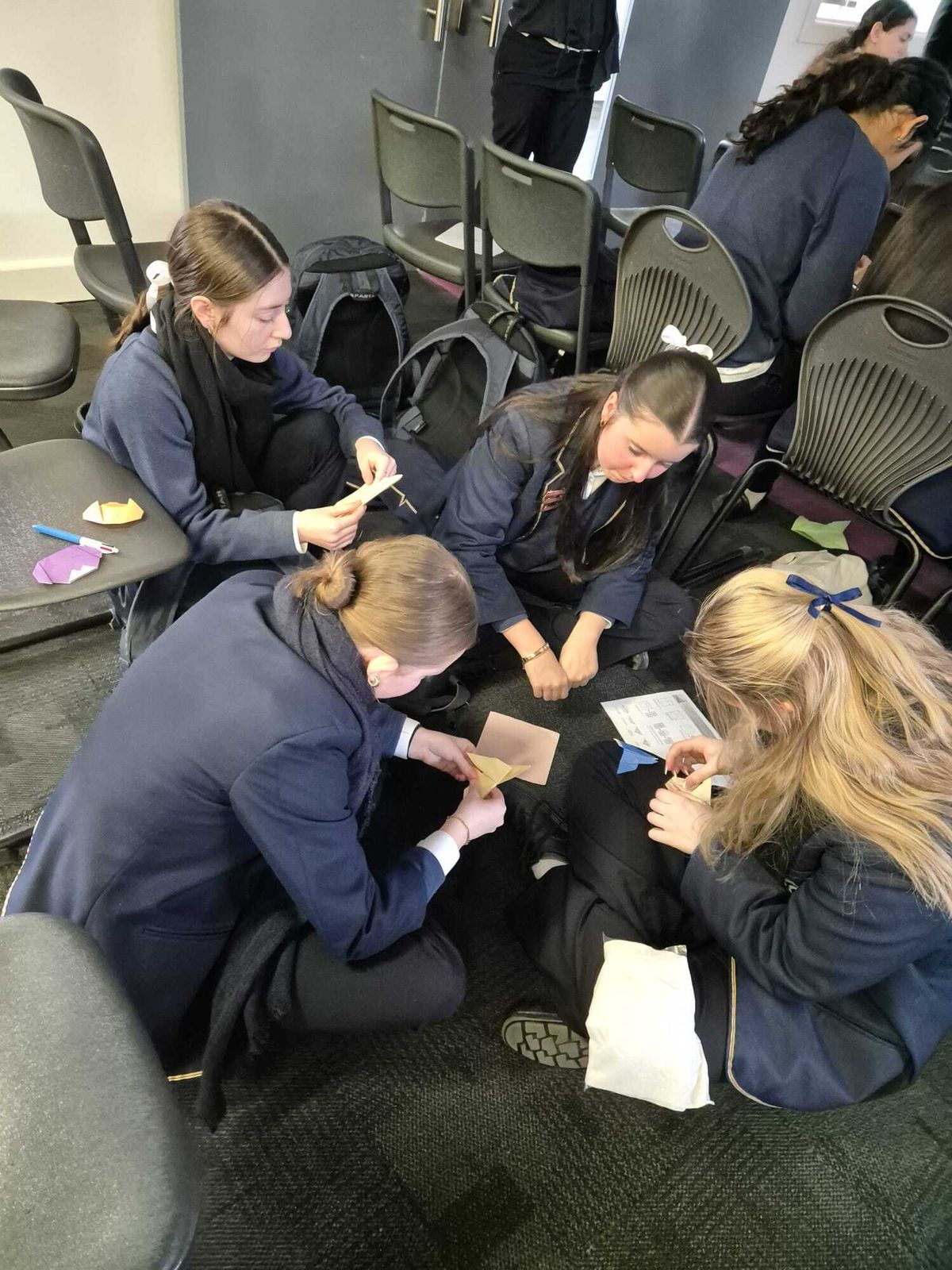After returning to the College, to conclude the day, students finished off their origami art activity. This tied in with a video viewed about how origami is about folding paper, creating creases in the crisp paper that remains but is then used to take on a new form or creation. This serves as a metaphor for our lives, suggesting that we only have one piece of paper, just as we only have one life. Even events that may challenge us or bring us down can be “lines or creases” that we use to make another shape. In this way, it is necessary to have those lines.