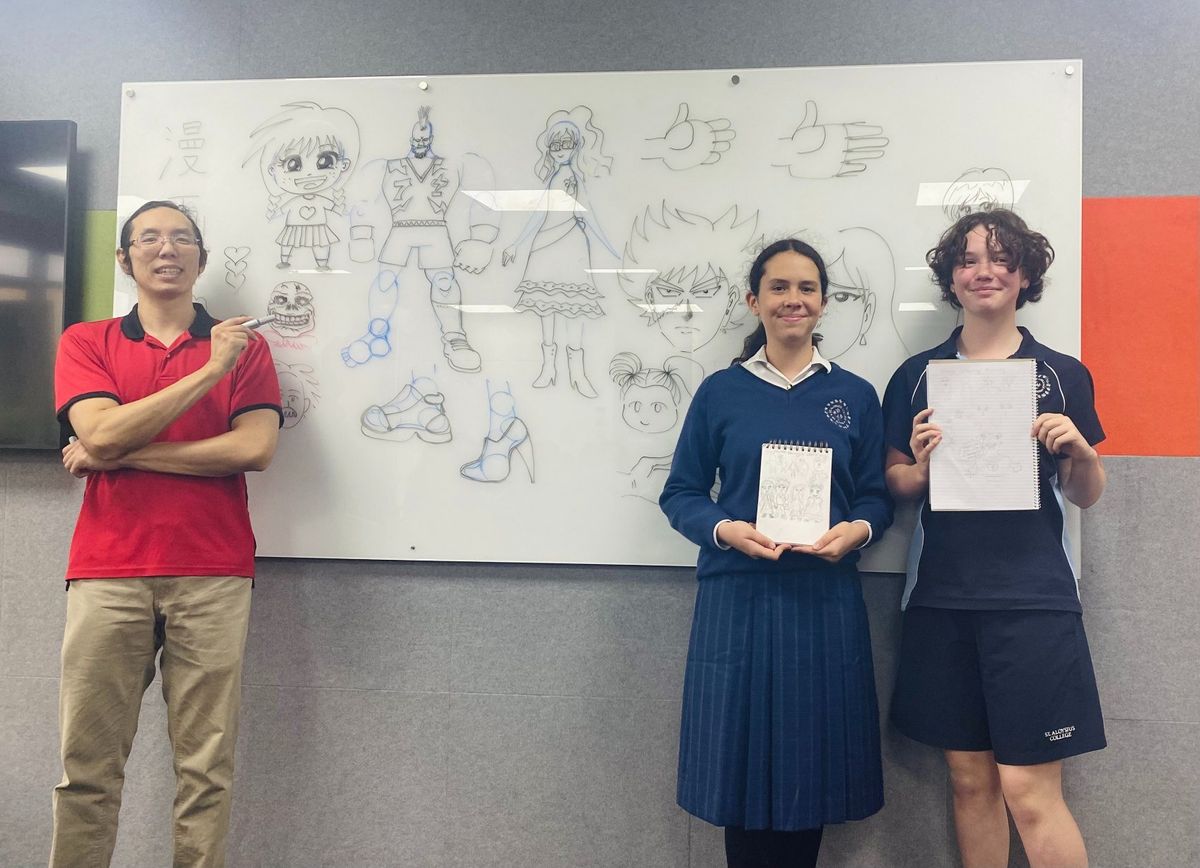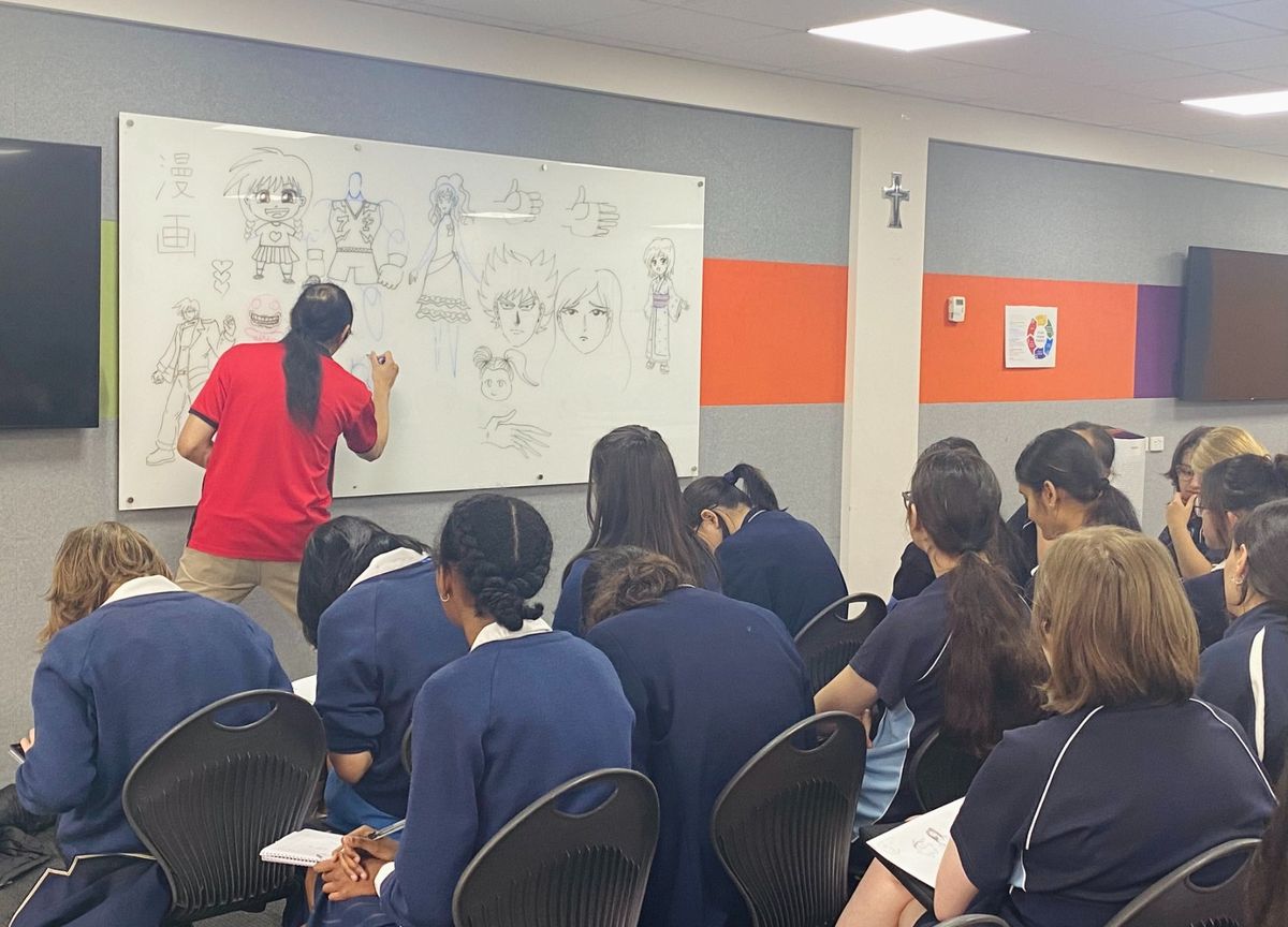 Year 8 Japanese students participated in a Manga drawing workshop this week run by Kenny Chan, a freelance artist and animator in comics, video games and movies. Students learnt about the use of manga in Japan and were guided through the process of drawing their own manga-style characters. Everyone enjoyed seeing how potato and carrot shapes suddenly turned into bodies and arms, and how changing the eyes and face shapes conveyed different personalities and emotions. All students thoroughly enjoyed the experience of putting their drawing skills to the test.