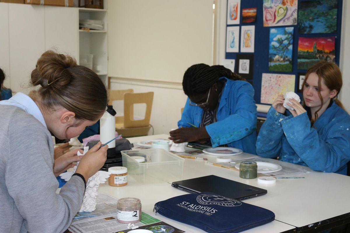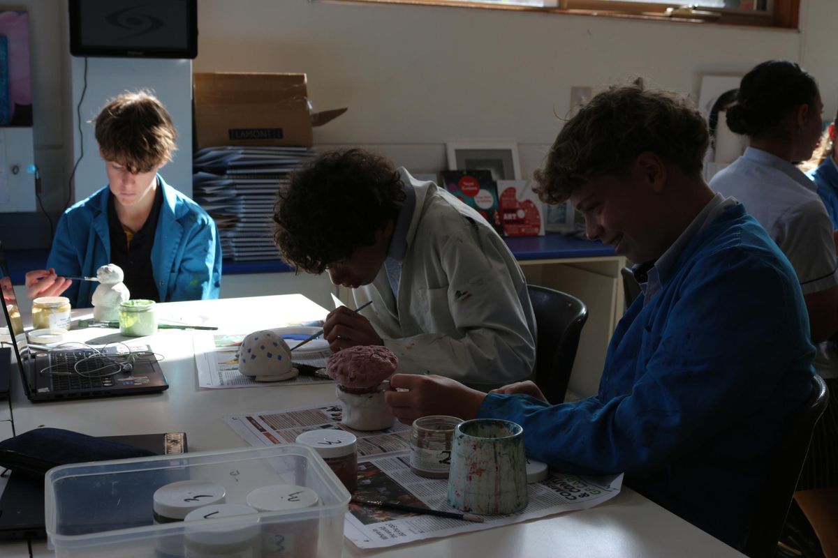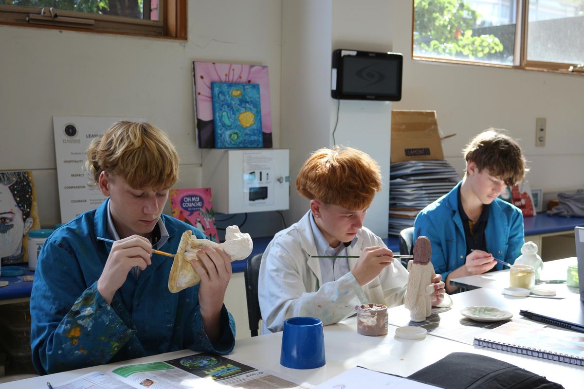 So far in Art 3D we have been able to learn about an artist named Vipoo Srivilasa who is a Thai artist who creates sculptures, some key things he has in his pieces are repetition and the colours blue and gold, using some of his pieces as inspiration we were able to start sketching and coming up with an idea of what we want to create. Once we had completed our sketches and decided on our final design, we were able to start playing with clay and making a small draft before our final piece. Once we were happy, we got to finally start on our finished product making sure we hollowed out pieces as well as smoothing rough edges. Before we finished term 1, we got to be creative with clay with some people hopping on the pottery wheel, some making plates and bowls. Over the holidays, many of the Sculptures got placed in the kiln and fired ready for us to start painting on underglaze. Today in class we are able mix different colours trying to achieve what our designs were. We are having so much fun and can't wait to see how they turn out.