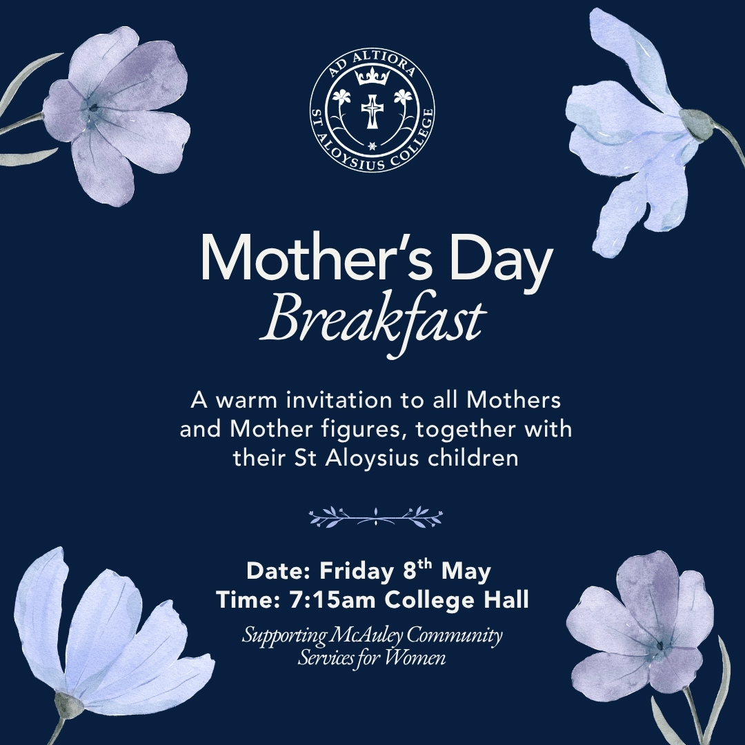 We are thrilled to invite all St Aloysius Mothers and Mother figures along with their children to the annual Mother’s Day Breakfast, taking place on Friday, 8th May at 7:15am in the College Hall.