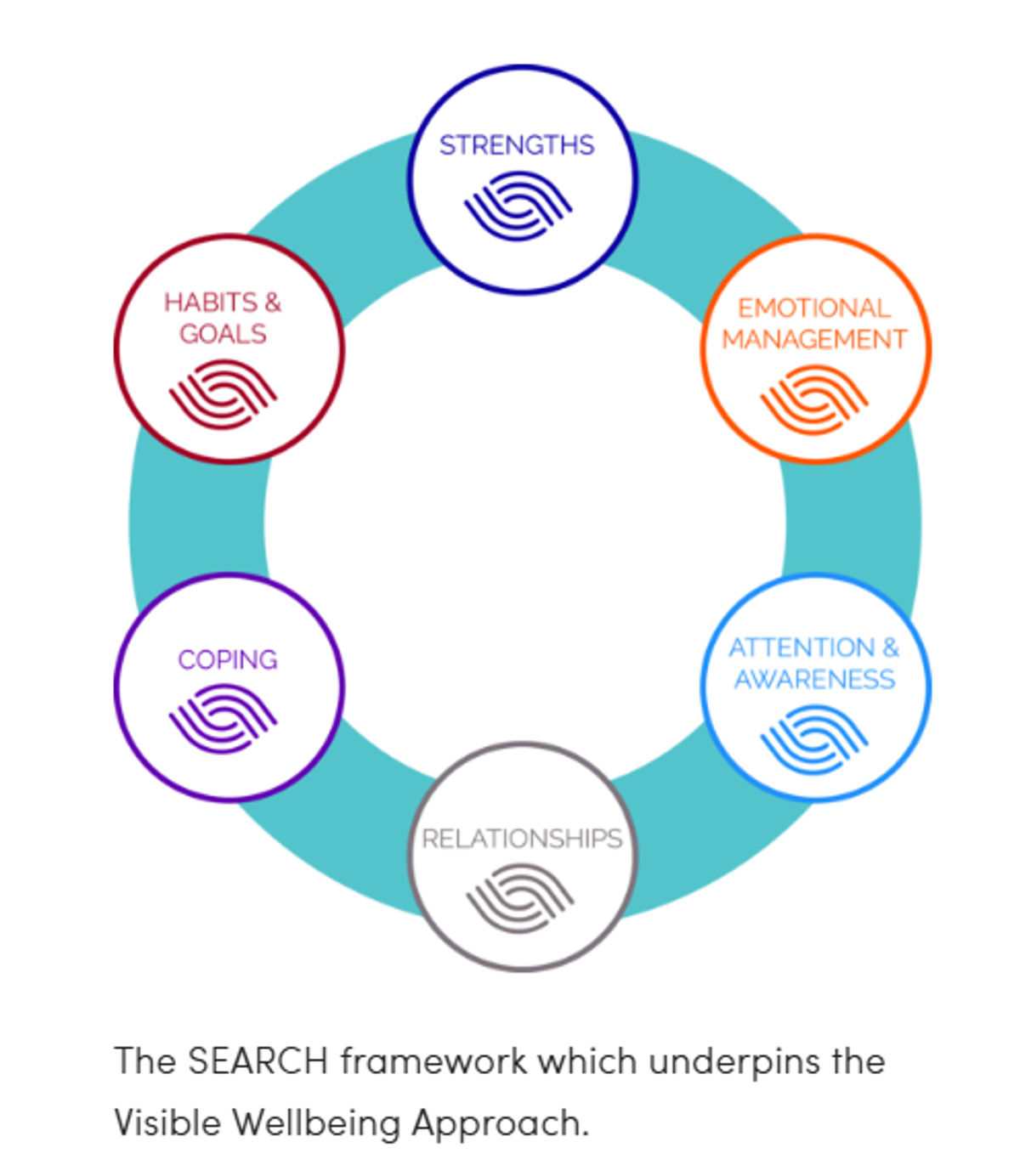 The program is underpinned by an evidence-based framework called SEARCH. This framework covers 6 pathways to wellbeing: